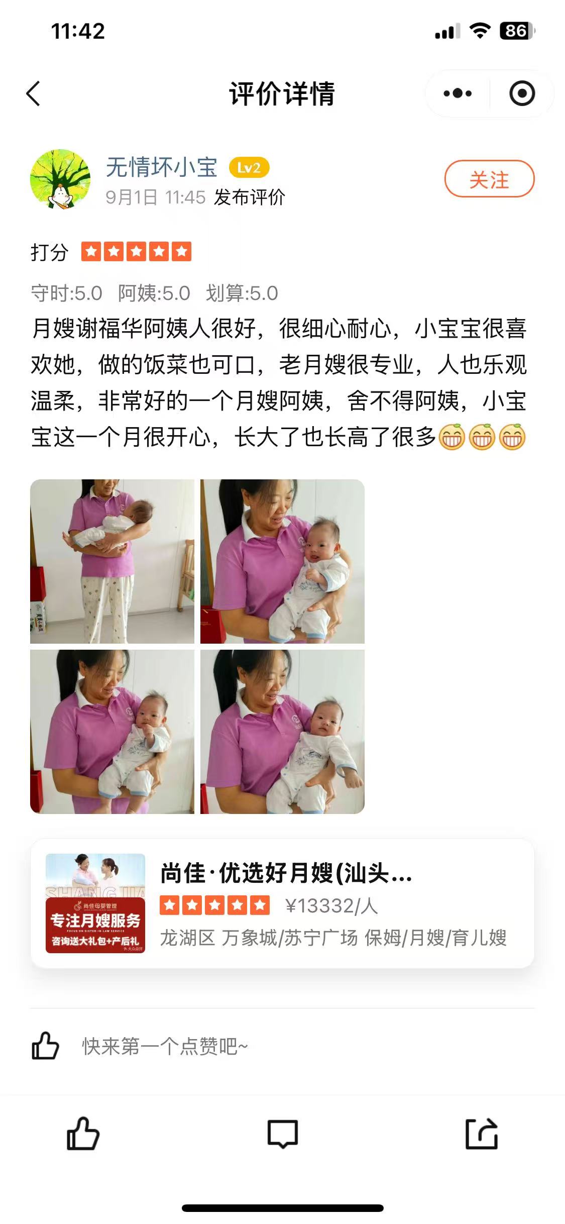 阿姐服務(wù)過(guò)程中做事腳踏實(shí)地,護(hù)理方面也是面面俱到,做的月子餐也是精致美味,祝阿姐以后的日期幸福美滿,順順利利,祝尚佳生意興隆,蒸蒸日上!