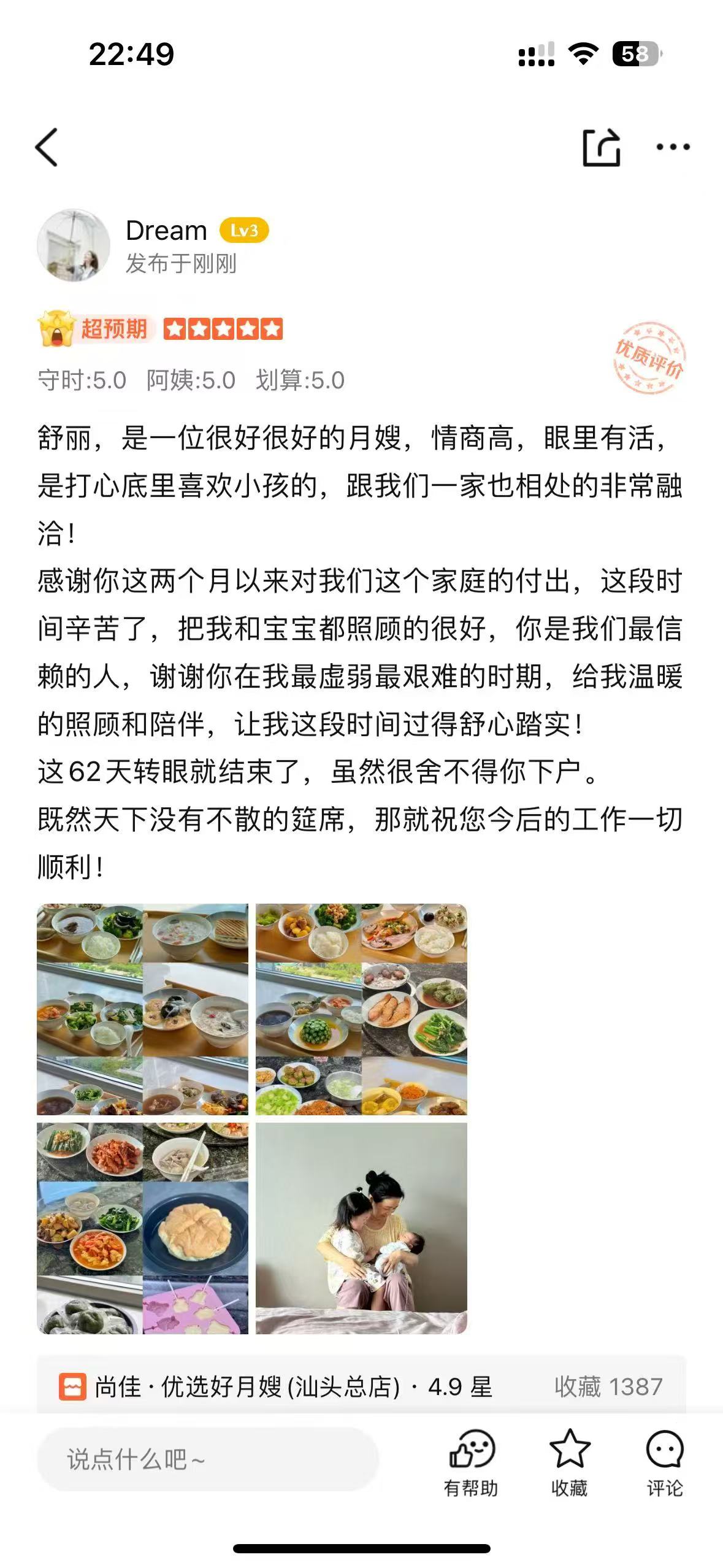 舒阿姨給予了我們很多育兒知識(shí),如寶寶的早教活動(dòng)、合理的飲食安排等,讓我們更加了解寶寶的需求,新手爸媽還是要請(qǐng)一個(gè)專業(yè)的月嫂照顧的,不止是月子期的照料,更是把后續(xù)都幫你安排的明明白白,感恩!