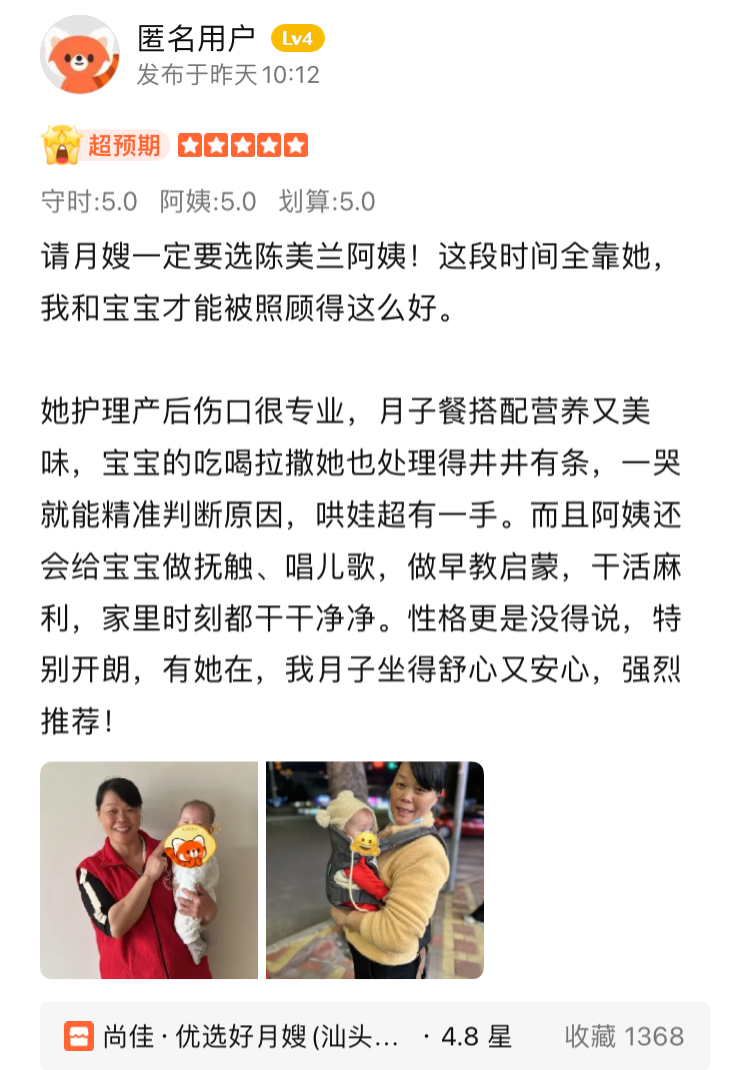 陳美蘭姐姐來自廣西合浦,她非常喜歡小孩子,對嬰幼兒護(hù)理頗有心得!她為人熱情大方,待人和善,非常樂于助人。為了更好地服務(wù)好客戶,她參加了尚佳公司平臺提供的考試,考取月嫂證,具備專業(yè)的月嫂技能。在月子餐方面,她比較擅長煲湯、潮汕月子餐等。